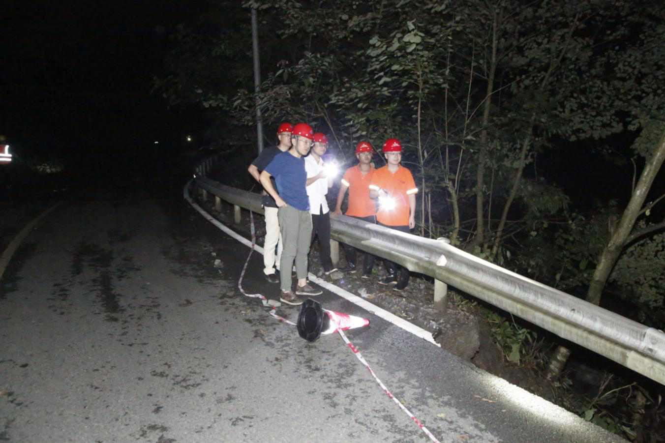 集團(tuán)搶險(xiǎn)隊(duì)伍21日夜間勘察水毀路段