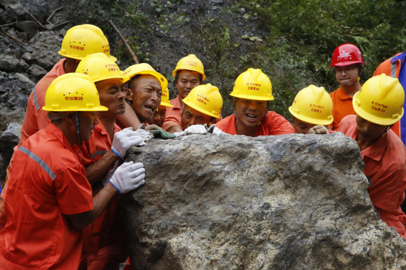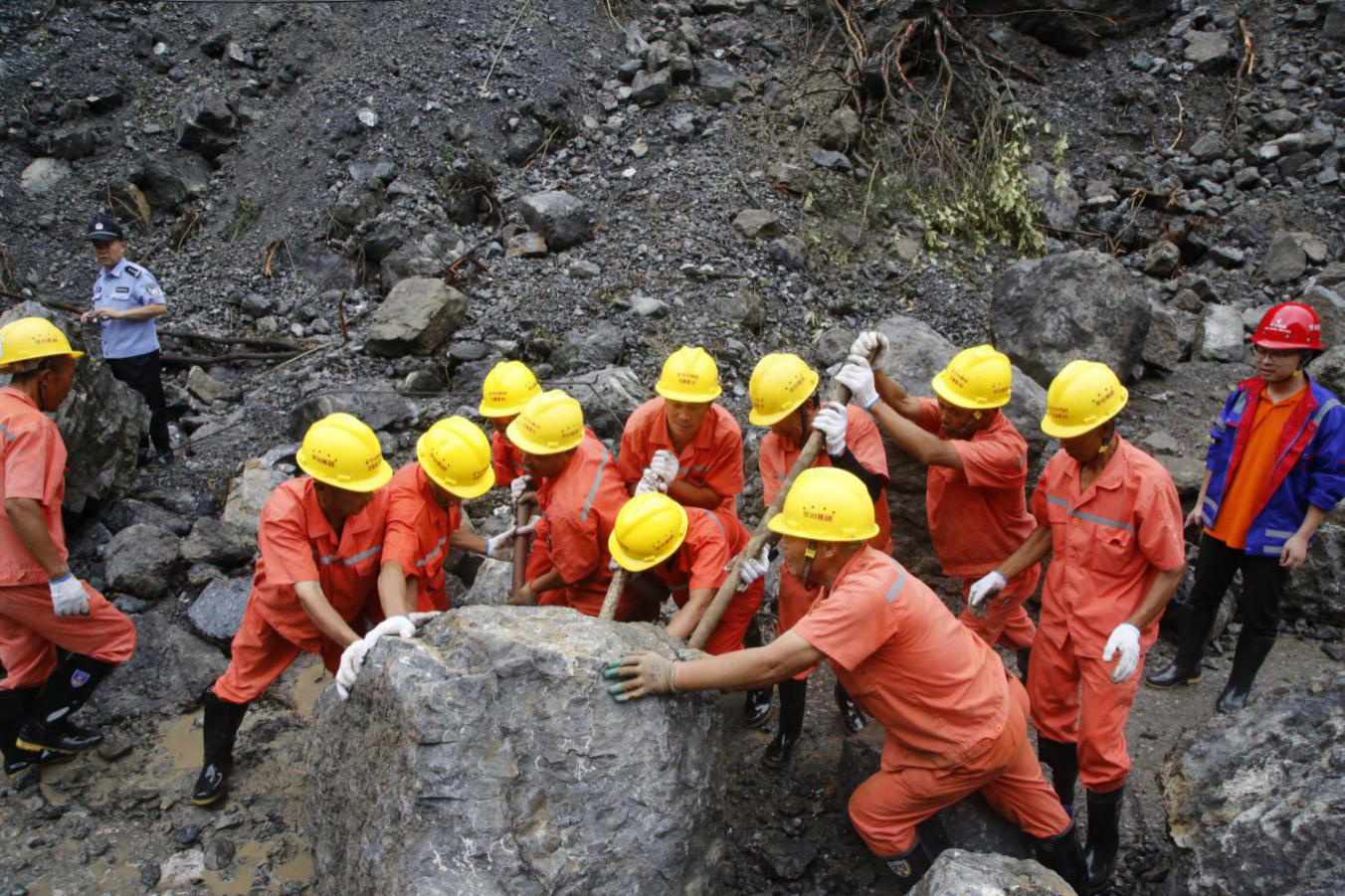 集團(tuán)應(yīng)急搶險(xiǎn)隊(duì)伍清理滑坡巖石