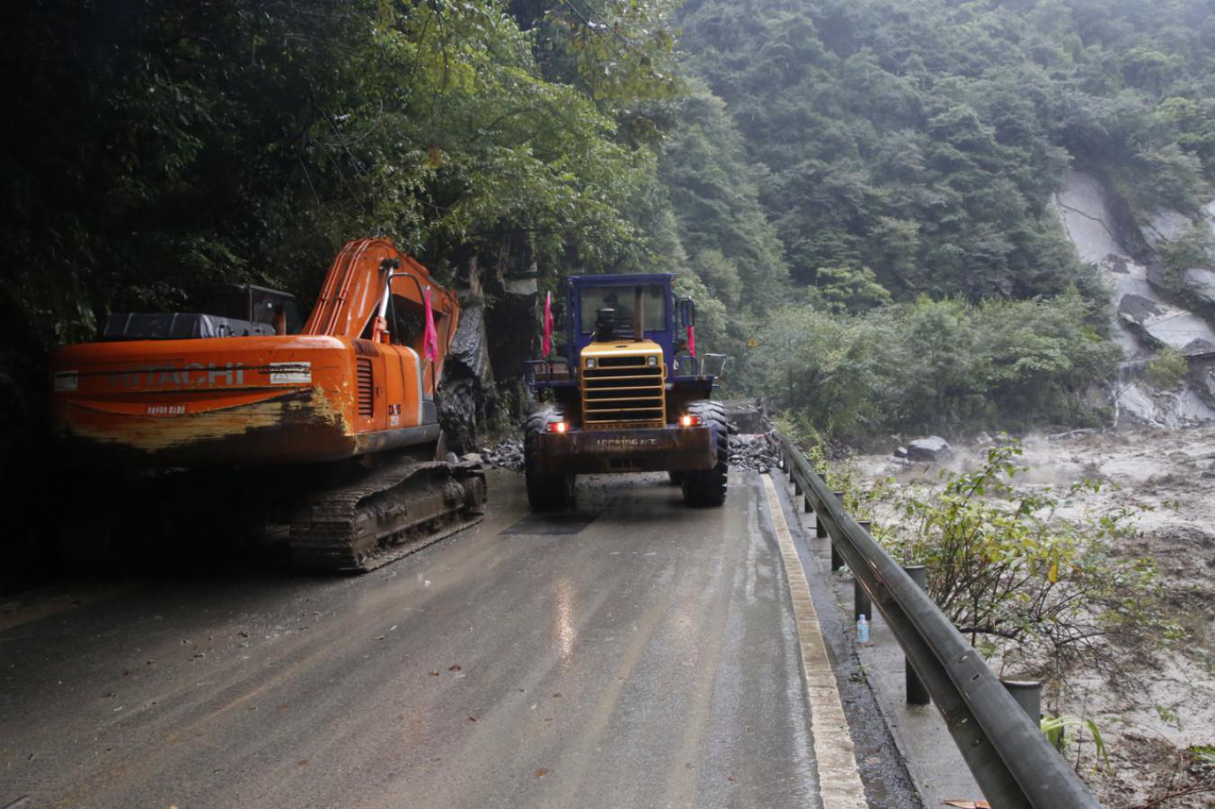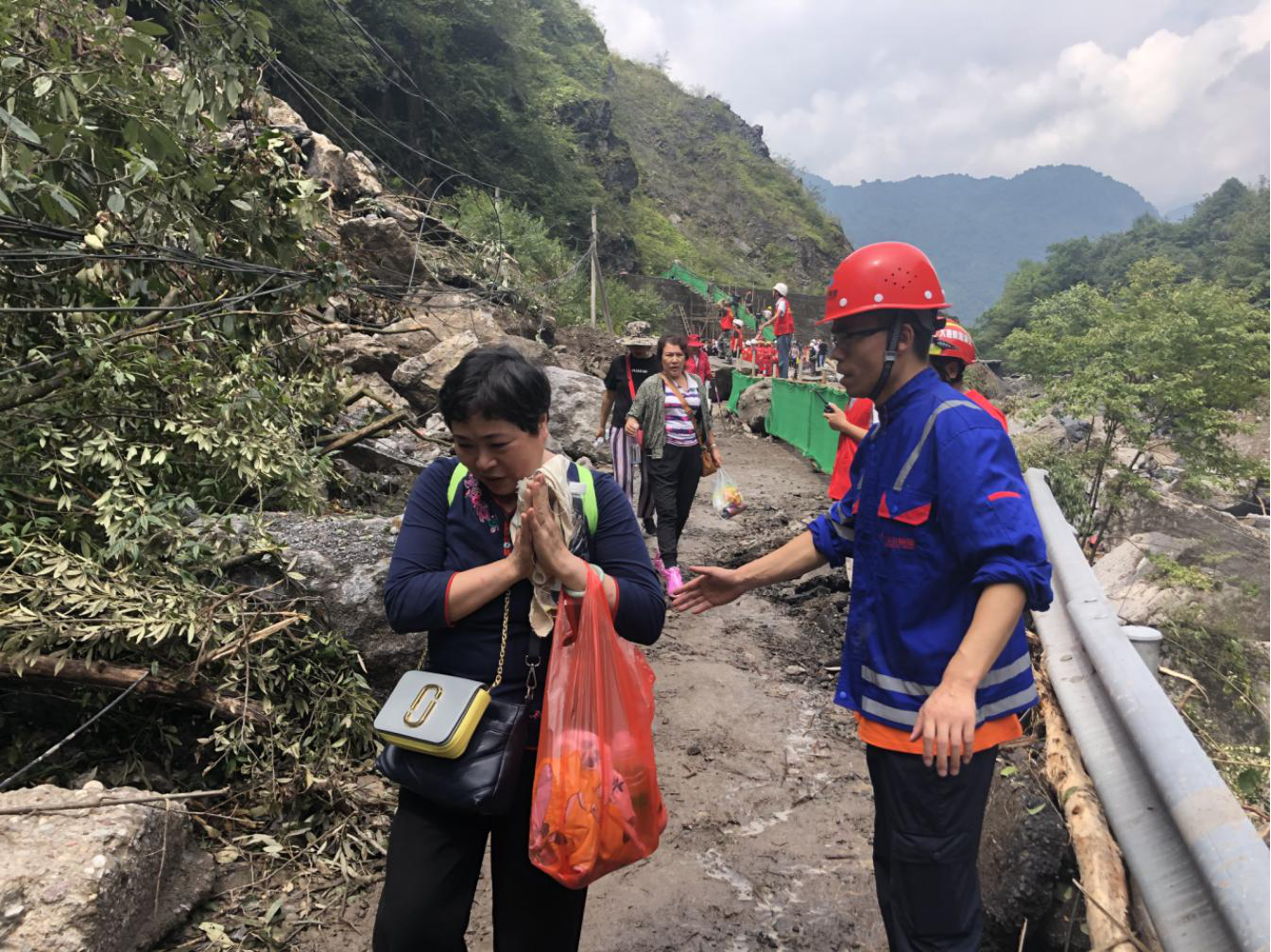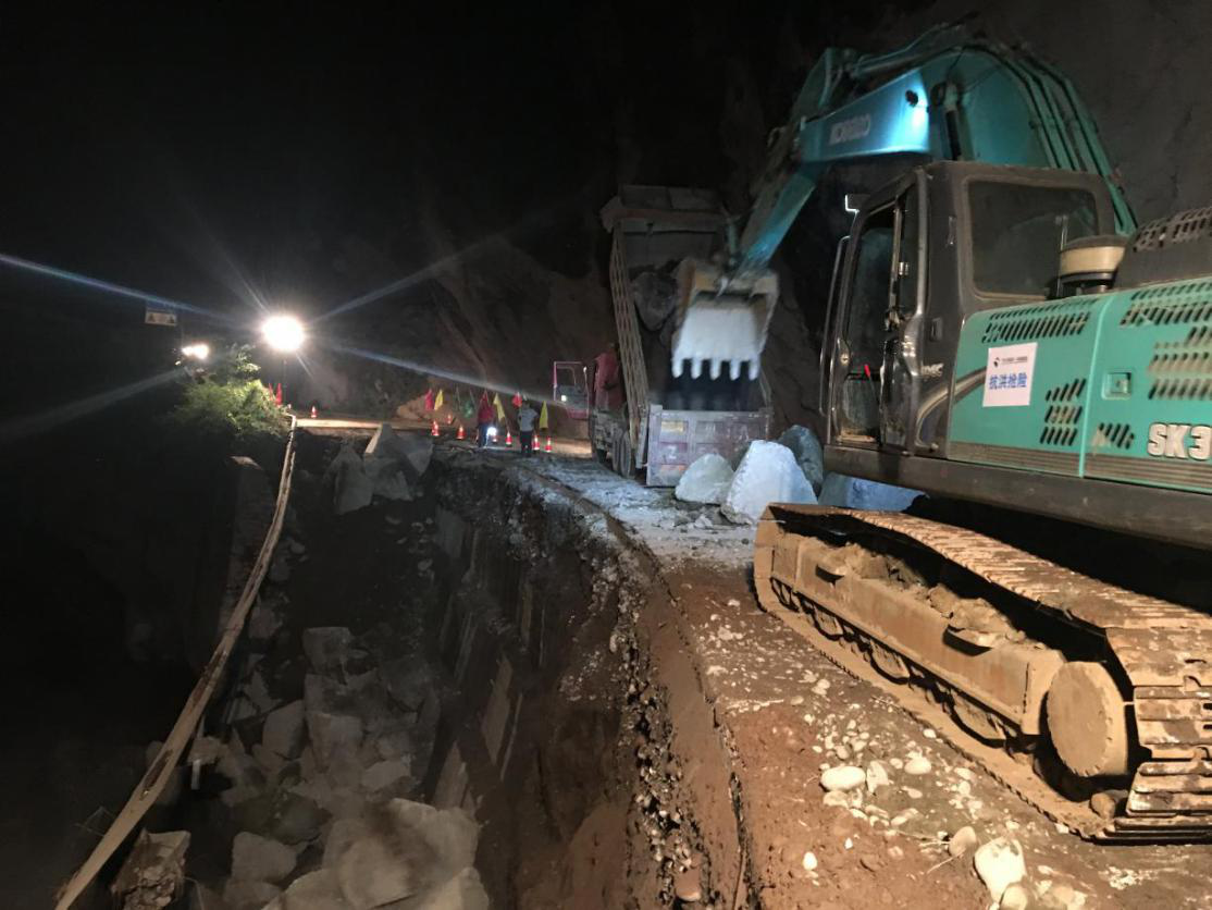 22日,集團(tuán)搶險(xiǎn)隊(duì)伍對(duì)5號(hào)山體滑坡路段進(jìn)行疏通,由于后方路段損毀嚴(yán)重,重型機(jī)械無(wú)法抵達(dá),搶險(xiǎn)隊(duì)員們冒著不斷滾落的滑坡碎石,采用人工清理的方式,用雙手與一塊塊巨大的滑坡石體相抗,最終及時(shí)疏通出一條可供人員通行的生命通道,滯留游客和群眾于22日下午開始陸續(xù)撤離。