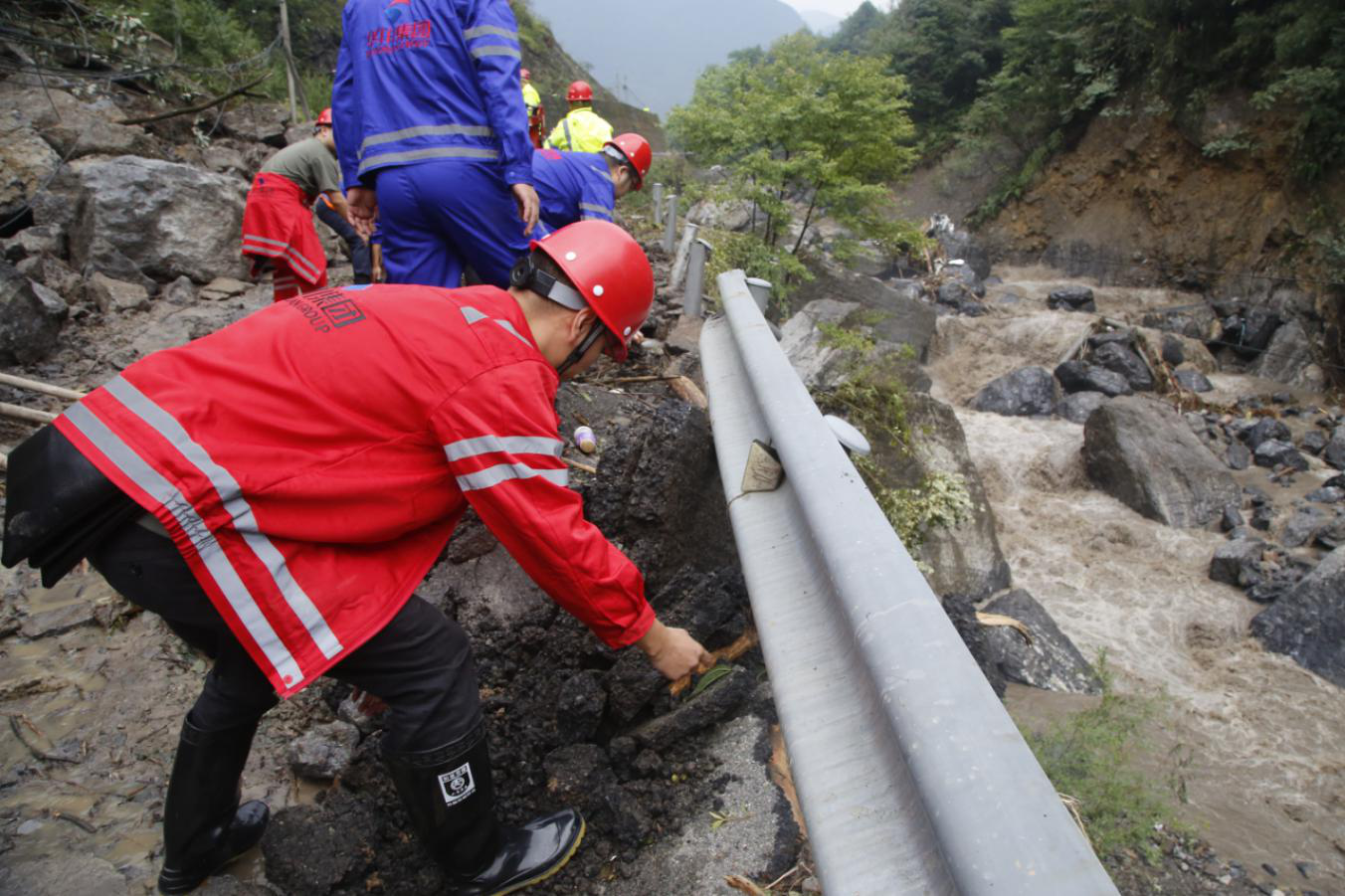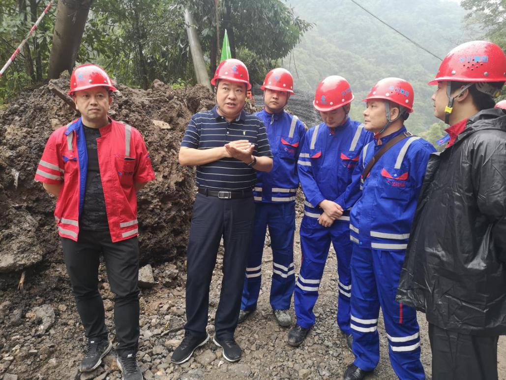集團(tuán)應(yīng)急搶險(xiǎn)隊(duì)伍人工清理被山體滑坡再次損毀的5號(hào)點(diǎn)位