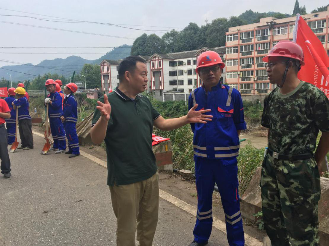 大邑縣交通局副局長(zhǎng)陳建偉與集團(tuán)應(yīng)急搶險(xiǎn)隊(duì)討論搶險(xiǎn)方案