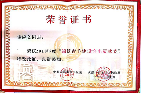 2019年7月,經(jīng)中共成都市青羊區(qū)委辦公室、成都市青羊區(qū)人民政府辦公室評選,集團(tuán)董事長、總裁謝應(yīng)文榮獲2018年度“錦繡青羊建設(shè)突出貢獻(xiàn)獎”先進(jìn)個(gè)人稱號。