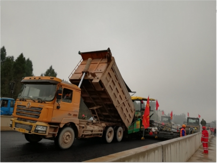本次試驗(yàn)段鋪筑在K48+570-K48+940,全長370m。為了成功完成試驗(yàn)段鋪筑工作,項目部精心組織,科學(xué)籌劃,專門成立試驗(yàn)段鋪筑管理小組,細(xì)化施工方案,明確人員分工。提前召開施工技術(shù)交底會,班前安全教育,從攤鋪、碾壓、運(yùn)輸車輛運(yùn)輸、施工溫度控制、人員組織等各個方面詳細(xì)交代,確保試驗(yàn)段一次性成功鋪筑。